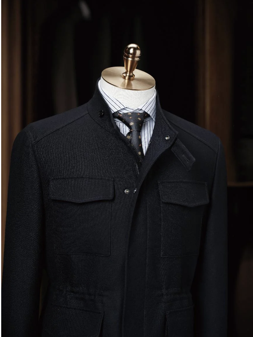 Dark Navy Funnel Casual Jacket / Beige Trousers Style No DBT6769- DBU3912/ Perfect for Suiting or Jackets, Trousers, Waistcoats. Delivery Once Measured 6-8 Weeks .