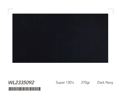 Dark Navy Single Breasted / Two Piece Suit Italian Pure Wool Super 120'S/ 270 grams Style No WL2335092 Perfect for Jackets, Trousers, Waistcoats.