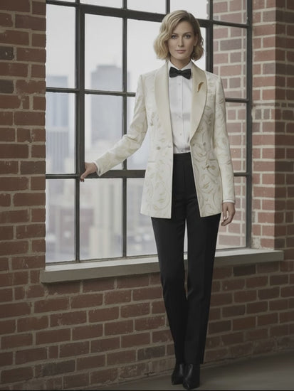 Women's Tuxedo Ivory and Gold Brocade Jacket, (Evening Wear Ceremony Book) 320 grams/ Perfect for Evening Wear, Weddings, Gold Range Made in Italy.