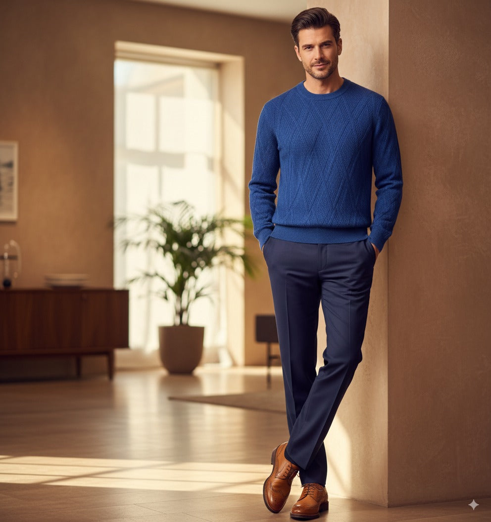 Mid Blue Crew Neck 100% Cashmere Cable Knit