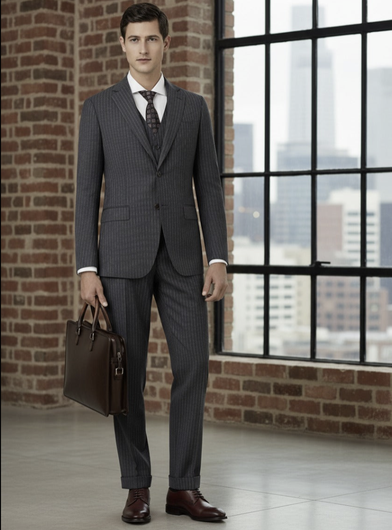Mid Grey Pinstripe Single Breasted / Three Piece Suit Italian Pure Wool Super 110'S