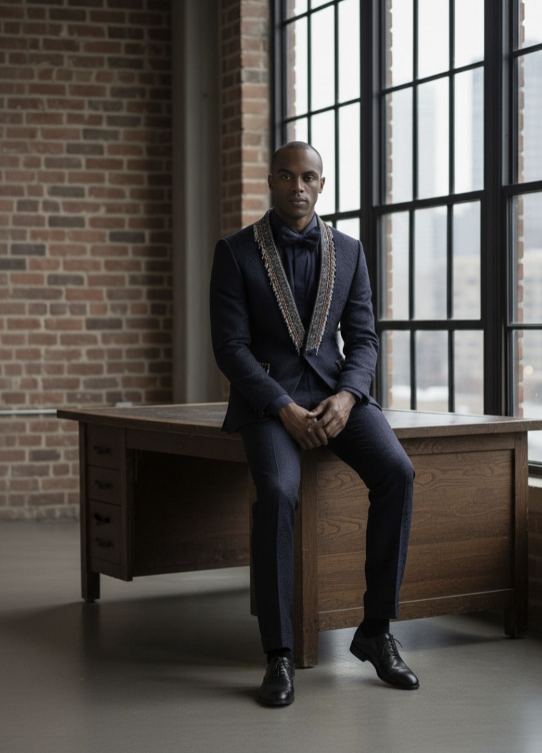 Tuxedo Navy Patterned Jacquard Jacket / (Evening Wear Ceremony Book) 320 grams/ Perfect for Evening Wear, Weddings, Gold Range Made in Italy.