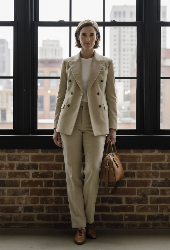 Women's Light Beige Cord Double Breasted Jacket / Light Beige Cord Trousers Style No DJJ0079